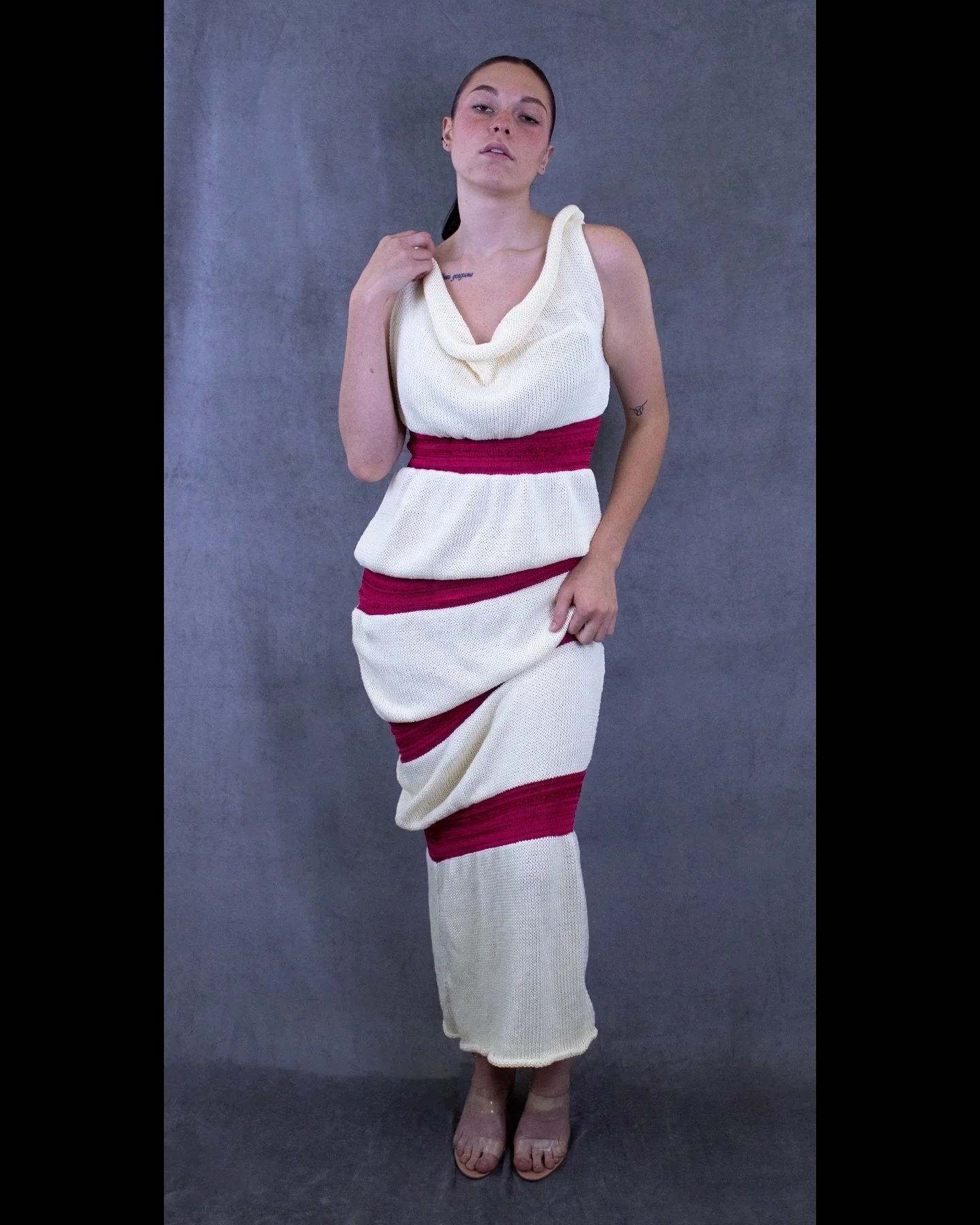 With realizing that she wanted to develop her technical skills along with refining her design aesthetic, she attended Moore College of Art & Design in Philadelphia, PA (2018-2022), where she earned her Bachelor of Fine Art in Fashion Design, with a minor in Textile Design. Here is where she first used a knitting machine, which would open her mind to new ways to design and sculpt on the body using texture and soft materials. Wanting to further explore the possibilities of machine knitting and knitwear, Christine gained a Master of Fine Art in Fibers from Savannah College of Art & Design (2022-2024). Her time at SCAD allowed her to experiment and refine her artistry and design philosophy.